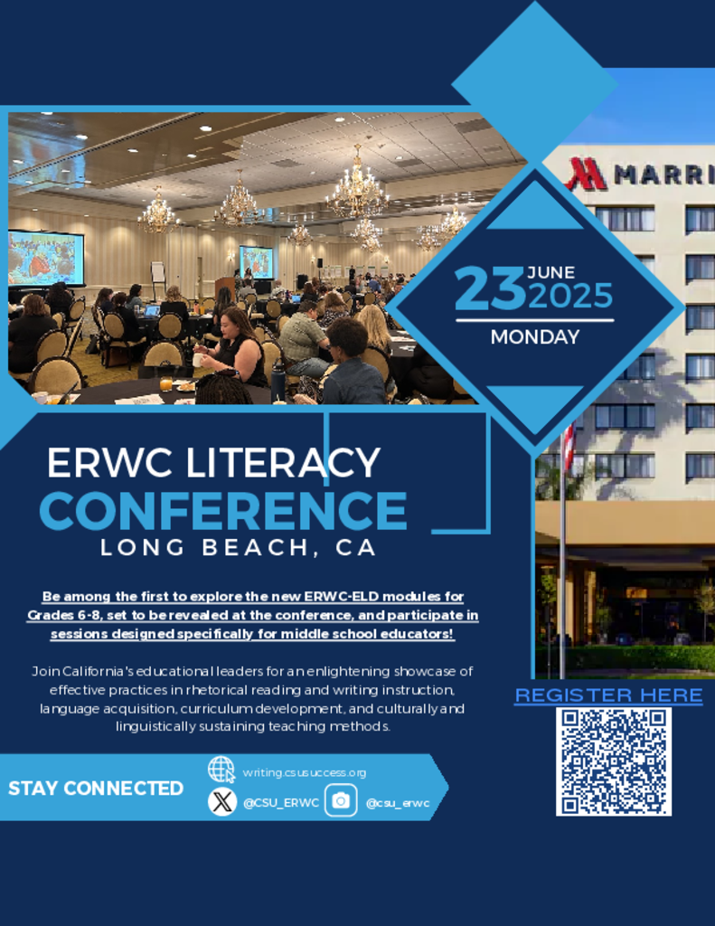 We’re excited to unveil our new ERWC-ELD Middle School Modules designed for grades 6–8 at this year’s ERWC Literacy Conference This link will take you to an external website in a new tab.! These modules are built to support both ELA with Integrated ELD and Designated ELD instruction, with a flexible structure that can also be adapted for ELA-only or ELD-only classrooms. As part of the conference, educators will get an exclusive first look at the modules and explore how they can be implemented in a variety of school settings. Additionally, there will be a strand with 2-3 sessions that focus solely on the middle school.
