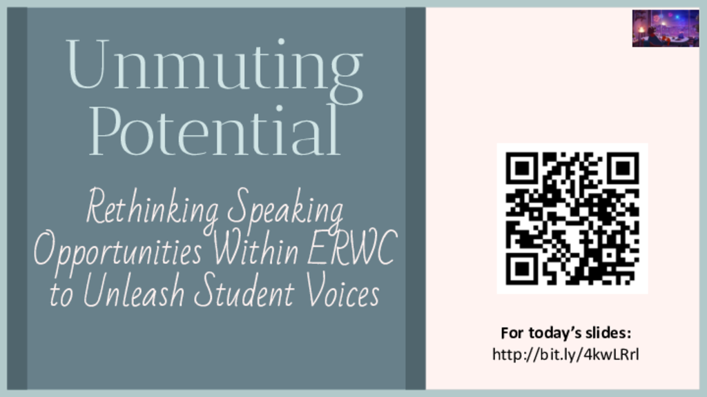 When many of us think of “speaking and listening” skills in our classroom, we imagine formal speeches, presentations, and discussions: the large culminating assignments. Rethinking this allows us to change the way we expect students to ‘speak up’ and how we assess their skill levels. Reevaluating ERWC module activities through the lens of diversifying speaking and listening opportunities in your classroom prevents the silence that stops the spread of diverse ideas, increases sharing of experiences, and allows students to participate in vital subject standards in meaningful ways. We will discuss strategies and differentiated ERWC lesson options where students find a variety of opportunities that allow them to unmute and reach their full potential.
