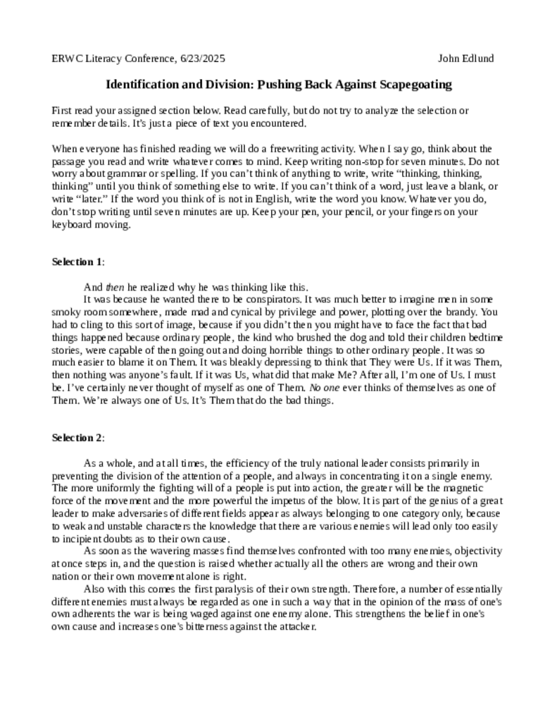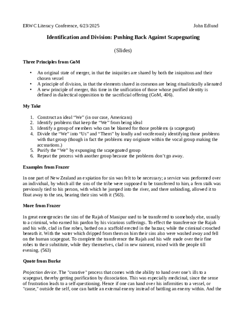 To live in a diverse society is to live in an ever-transforming matrix of conflicting identifications and divisions. We celebrate our our identities and negotiate our divisions in order to form and maintain a vibrant whole. However, an aspiring demagogue can exacerbate and exploit division to gain power through a scapegoating process, projecting all the ills of society on a targeted group. In this session, informed by concepts from Kenneth Burke, we will explore the animus, the projection, the rhetoric, and the magical thinking behind the scapegoating process, while we brainstorm and workshop strategies and countermeasures for our classrooms.